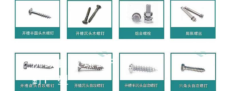 平杯)、半圓頭內六角螺釘(圓杯)、十字槽盤頭機螺釘、十字槽沉頭機螺釘、十字槽大扁頭機螺釘、十字槽盤頭自攻釘、十字槽沉頭自攻釘、十字槽大扁頭自攻釘、全牙絲桿(牙條)、六角螺母、法蘭螺母、尼龍螺母、蓋型螺母、蝶型